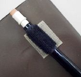 |  オリジナル野帳用ペンホールダー  きたきつねは文房具ファンであると同時にバードウォッチャーでもあるので、バードウォッチングに行くときに記録のためにノートを使っている。私の使っているのは、測量用の野帳で、レベルブックとスケッチブックの2種類を良く使っている。シャツの胸ポケットにぴたりと収まる大きさで、表紙が厚く片手に持って記録を書き込むのに最適なものだ。もちろん野帳に書き込むのは鉛筆が適している。鉛筆は、雨でも雪の中でも使えるし、消すこともできる。でも出先で芯が折れるとナイフがないとこまるので、0.9mmのシャープペンシルを使っている。それもプラチナの「プレスマン」に決まりなのだ。 このシャープペンシルと野帳を別々に持って歩くと、シャープペンシルを落としてしまうことが多い。一度、シャープペンシルに紐を付けて野帳に固定して持ち歩いたことがあるが、紐がじゃまでどうしようもなくてこまった。 そこで、考え出したのがベルクロ(別名:マジックテープ)を利用することだった。シャープペンシルにベルクロの柔らかい方を止めて、野帳にベルクロの固い方を付け、それにシャープペンシルを固定する方法だった。でき上がった野帳は非常に便利で、それ以来シャープペンシルをなくすことが無くなった。ベルクロ付の野帳がもう10冊近くなった。 このペンホールダーは、アウトドアー雑誌「Be-Pal」にアイデアとして紹介された。  |